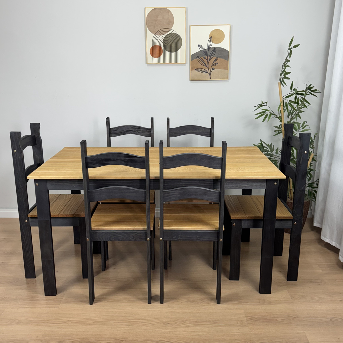 - A mesa e as cadeiras são confeccionadas em madeira maciça pinus, conhecida por sua resistência e beleza natural. Cada peça exibe a textura única e os veios distintos da madeira, proporcionando um visual autêntico e requintado.