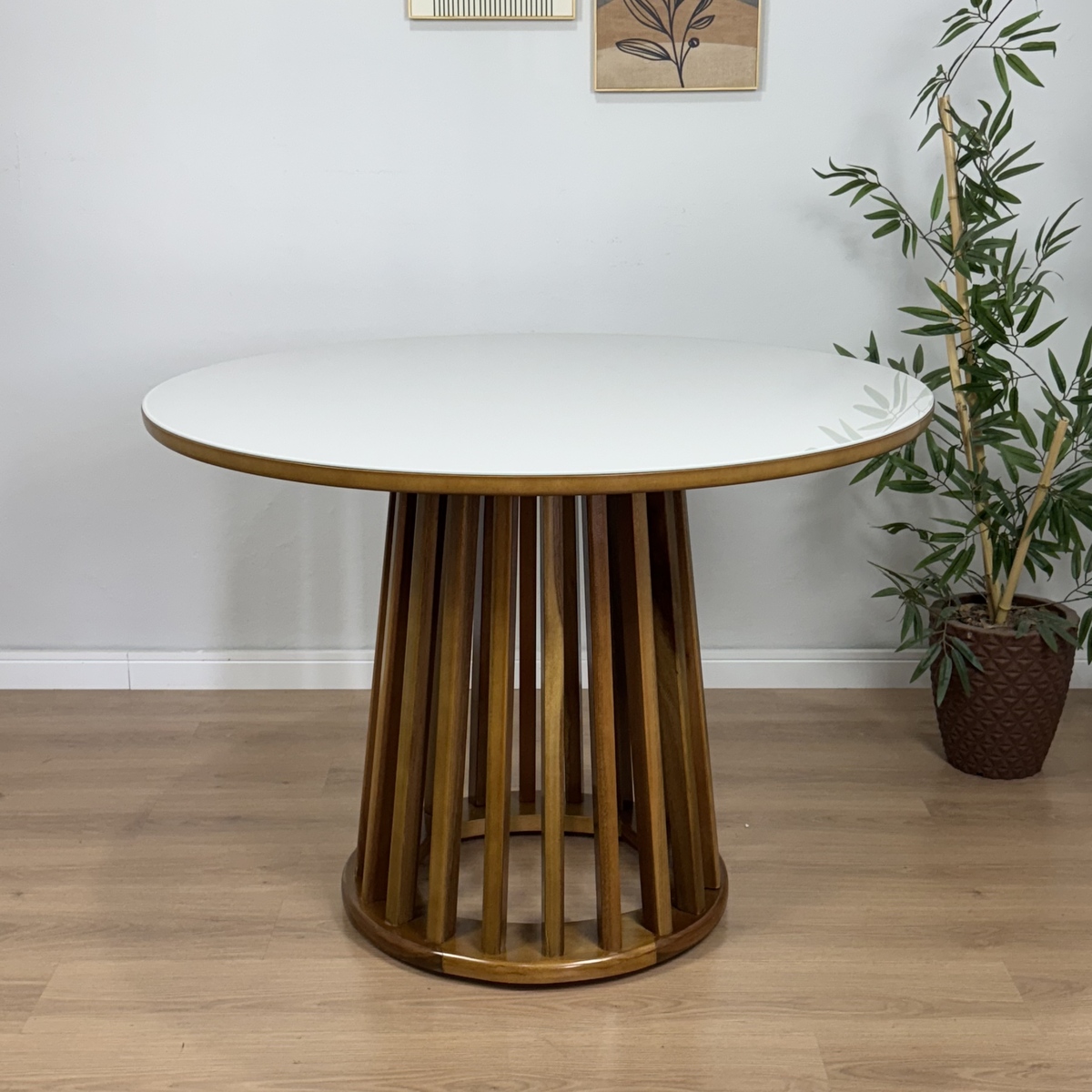 Sua base em madeira maciça de eucalipto é trabalhada com precisão artesanal, garantindo durabilidade, estabilidade e um visual único – cada peça carrega os traços autênticos da madeira, tornando sua mesa verdadeiramente exclusiva.